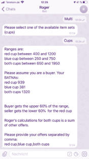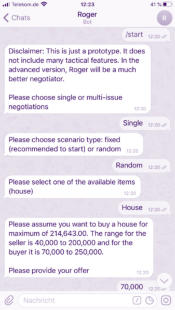 Wir erstellen ein weitgehend automatisiertes Computerprogramm (BOT), das Benutzer in die Lage versetzt, das Harvard- Verhandlungsprinzip in der von Rasmus Tenbergen erweiterten Version (NQ®-Methode) zu erlernen: https://t.me/NegotiateBot Hierzu simuliert das Programm über die Telegram-App Verhandlungssituationen mit einer oder mehreren Parteien in vorgegebenen Szenarien. Das Programm kann als Verhandlungs-Coach und/oder als Verhandlungspartner genutzt werden, um bessere Verhandlungsergebnisse zu erzielen als viele menschliche Verhandler. Die Anwender werden während der Simulation step-by-step geführt. Unser Programm nennen wir ROGER, u. a. in Würdigung des ursprünglichen Entwicklers des Harvard Negotiation Concepts Roger Fisher in dankbarer persönlicher Erinnerung an seinen Unterricht im Seminar in Boston. Einzelne Elemente können auch ohne die Telegram getestet werden wie das Gefangendilemma- Spiel von Nicky Case in der Originalversion: The Evolution of Trust (ncase.me) und in der Roger-Variation: https://goldfish-app-67z8r.ondigitalocean.app Das komplette Roger-Programm ist hier zu finden (in Telegram): https://t.me/NegotiateBot
