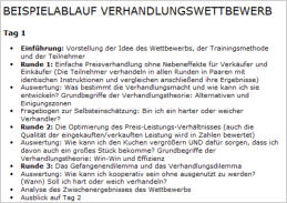 Testen Sie Ihre Verhandlungskompetenz oder die Ihrer Mitarbeiter mit dem Top-Ten-Negotiator-Verhandlungswettbewerb!Wie funktioniert der Verhandlungswettbewerb?Die Teilnehmenden bekommen in mehreren Runden die Aufgabe, vorgegebene Verhandlungs-Fallstudien/Rollenspiele (fachfremd oder aus ihrer Praxis) so durchzuführen, dass sie dabei eine möglichst hohe Punktzahl bekommen. Die Punktzahl reflektiert alle wesentlichen Aspekte der jeweiligen Verhandlung („Scoreable Negotiation Analysis“). Die Punktzahl kann mit derjenigen von Teilnehmenden mit identischen Instruktionen verglichen werden, so dass erkennbar ist, ob der entsprechende Wert ober- oder unterhalb von 100% des Durchschnittsergebnisses liegt. Über mehrere Runden kann ein Gesamtergebnis ermittelt werden.Wie kann ich bzw. können meine Mitarbeiter am Verhandlungswettbewerb teilnehmen?1. Die Testvariante: Sie können kostenlos durch eine formlose Anmeldung an rt@verhandlungstraining.biz an einer Testvariante in drei Runden teilnehmen, die online oder offline per E-Mail, Telefon oder in persönlichen Treffen mit Ihren Verhandlungspartnern durchgeführt werden.2. Die Inhouse-Variante: Sie können Ihren eigenen Verhandlungswettbewerb in Ihrer Organisation durchführen. Ein auf Ihren Bedarf abgestimmtes Angebot wird Ihnen gerne nach einem telefonischen Vorgespräch unterbereitet.Was bedeutet die „mittelharte“ Variante?Das Format des Verhandlungswettbewerbs hat sich in der Praxis besonders in der sogenannten „mittelharten“ Variante bewährt. Die „mittelharte“ Varianter ist „weicher“ als ein Assessment-Center, bei dem es um die reine Leistungsdiagnostik geht und „härter“ als ein reines Training, bei dem die Ergebnisse weniger wichtig sind. Die Teilnehmenden werden ermutigt, die Ergebnisse gleichzeitig locker und ernst zu nehmen: locker insofern als sie Dinge riskieren und testen sollen, die sie in der Praxis nicht wagen würden und schlechte Ergebnisse unproblematisch oder sogar zu Lernzwecken erwünscht sein können; ernst insofern als sie mit sportlichem Ehrgeiz versuchen dürfen, den Wettbewerb zu gewinnen. Es gibt in diesem Format immer die (nicht überprüfbare) gute Ausrede für schlechte Ergebnisse, experimentiert zu haben. In der „mittelharten“ Variante können außerdem schwächere Ergebnisse nur abhängig vom Wunsch der Betroffenen analysiert werden.Selbstverständlich ist auf Wunsch auch die Durchführung des Wettbewerbs in einer härteren oder weicheren Variante oder in anderen Variationen möglich.Einen Erfahrungsbericht über einen Verhandlungswettbewerb finden Sie auf der Website von People2Move ...Ein Beispiel für einen möglichen Ablauf des Verhandlungswettbewerbs finden Sie hier ...